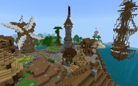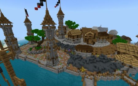 This is a medieval themed custom village which has many that are decorated for the interiors. There are several cultivation areas and a large port for boats.  There is an area for merchants. With this map you can play with your friends.