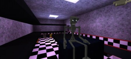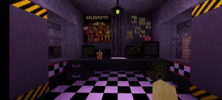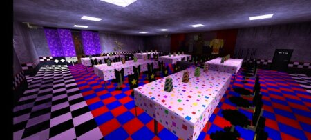 The map features 3D models, cameras, scary sounds, good gameplay, edible pizza, mechanical doors, live animatronics that come to life at night: Bonnie, Chica, Freddy, foxy, endoskeleton.