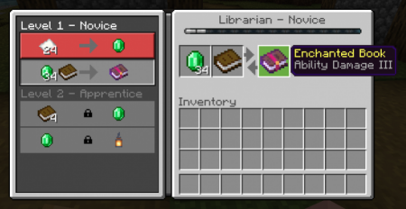 Ability Damage Enchantments I, II, & III in librarian villager trades (enchanted book)