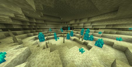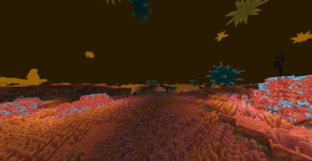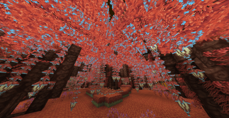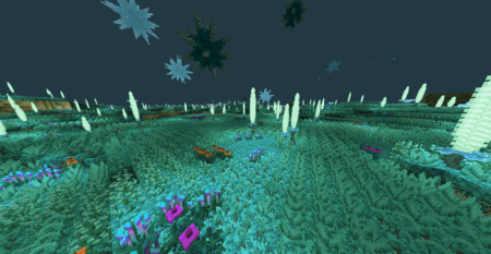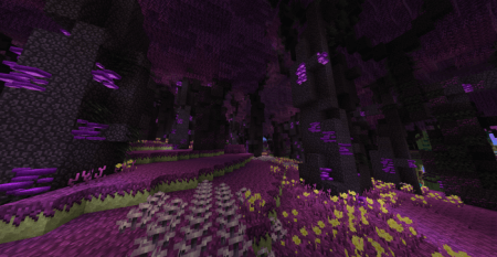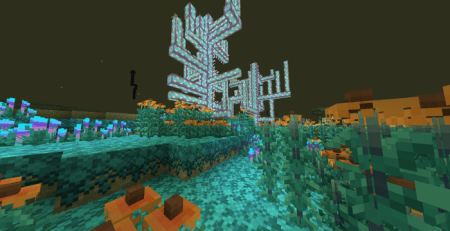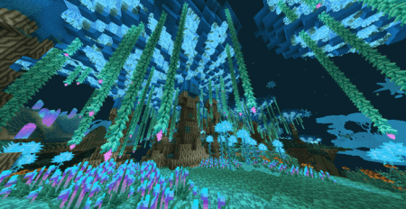 Chorus Forest are islands with chorus plants and large mushroom covered trees. Small ponds with charnia as well as violecite ruins can occasionally be found scattered through the forest.