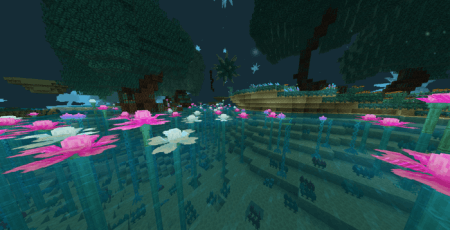 Lantern Woods are vibrant forests with glowing flowers resembling lanterns hanging from trees and even floating in the sky. Small ponds with lilypads and anemones can occasionally be found in this biome.