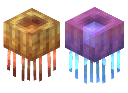 Cubozoa are glowing jellyish-like mobs that can be found in bodies of water. Their colors vary depending on the biome they are found in. If you are careful they can be captured alive with a bucket, but beware of their poisonous touch.