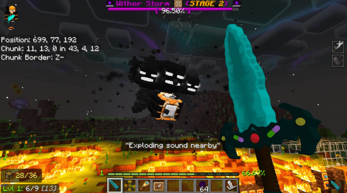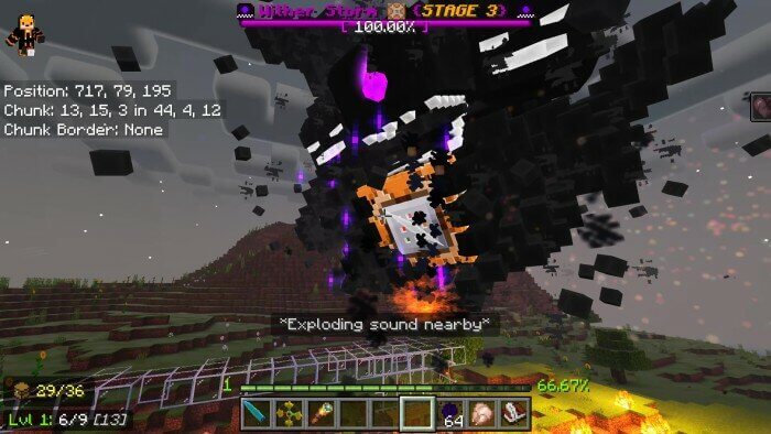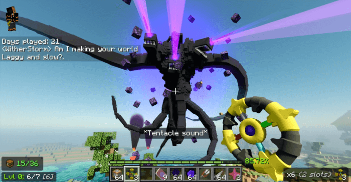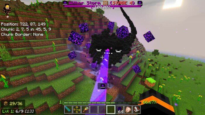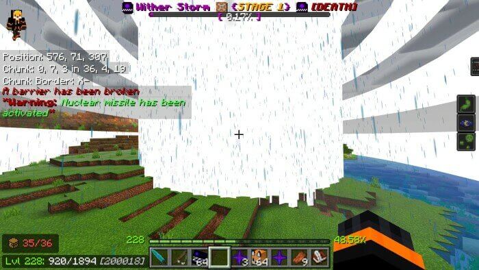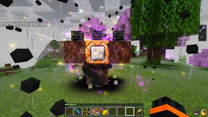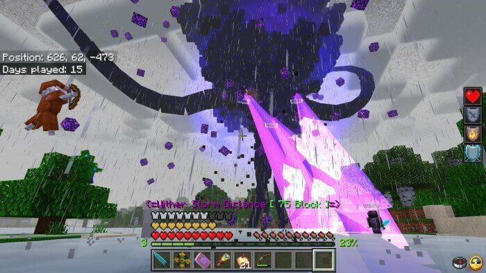 This is the final stage of this Demo, the debris flies in a circle above the Wither Storm, its tentacles are longer and the attack range is also longer, it begins to rain and thunder.