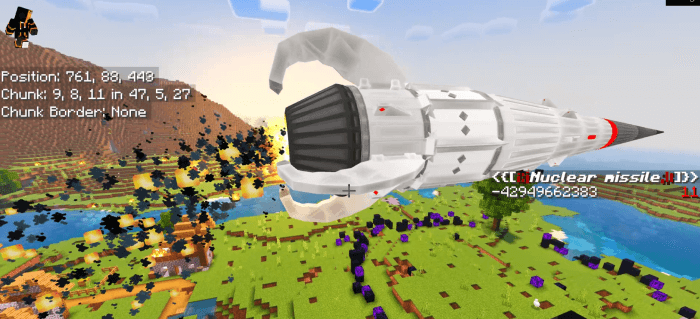 As its name suggests, the item will summon a nuclear missile, it has tremendous destructive power and kills everything in a 73 block radius, it is for killing Wither Storm destroyer stage
