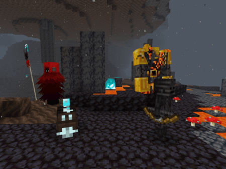 When exploring, do be wary of the new and updated mobs to be found in the Nether, as many of them are't friendly. Shroomlight Bugs and Pests inhabit the two forest biomes and are neutral, but Pests will become aggressive if they spot you taking any Corrupted Melon since they like it so be careful around them! You can collect some Melted Shroomlight by using a bottle on the bugs, and drink that to clear the Wither effect or brew potions with it, whereas Pests may drop glands that can be used for crafting. The forests also inhabit Wart Crushers, hostile amalgamations of warts and fungus that will attack you on sight; proceed with caution through these biomes. Other hostile mobs include Soul Scuttles found in Soulsand Valleys, Necromancers which only spawn in the Soul Towers structure in the Soulsand Valley and the Basalt Giant, a powerful monolith of basalt and magma that resides in the deltas biome. If all that wasn't bad enough, Wither Skeletons can now sometimes spawn with a bow and shoot withering arrows at you!