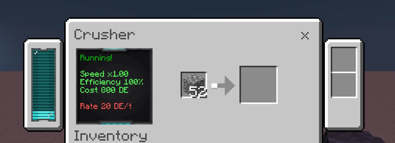 Everything runs on Dorios Energy (DE). Generate power with furnaces, lava, sunlight, and more, then store it in batteries and feed it into your machines. - Machines