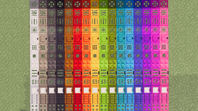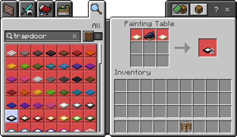 All vanilla trapdoors can be dyed using this new crafting table. The available recipes allow applying any of the 16 vanilla colors to trapdoors, as shown in the image below.