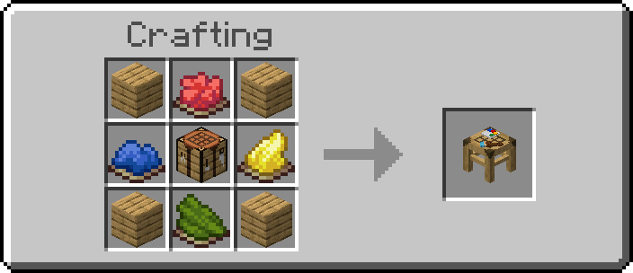 First, craft the new crafting table. This table is required to dye trapdoors and is made using a specific recipe, shown in the image below. Once crafted, place it like any other workstation.