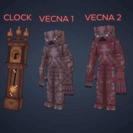 Vekna 1: one of the strongest mobs in this expansion. It has as much as 500 health points, when it sees the player, it starts lifting him up the mountain and then instantly kills him, but if during the climb you exceed its strength, it will start chasing you. The mob can be summoned using a clock that can be created in survival