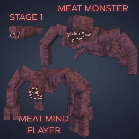 Meat Mind Flayer: Another new mob, very dangerous, has 300 health, as well as high-quality death, movement and roar animations. It is formed if another (small) meat monster is combined with it.