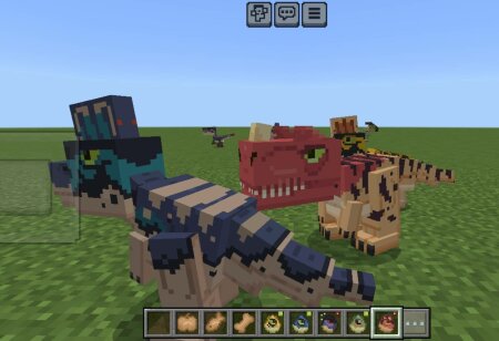 You can create them at the crafting table, or you can find them roaming around the world in different biomes. To tame them, you must craft a specific type of cookie depending on each dinosaur’s diet, which is indicated by a color in the top-right corner: RED – CARNIVORES GREEN – HERBIVORES BLUE – PISCIVORES