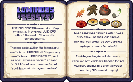 LUMINOUS BEASTS adds TWENTY FOUR legendary beasts into the game, from forest Tree Ent's to Piglin Executioners. Hunt them down to get new loot!