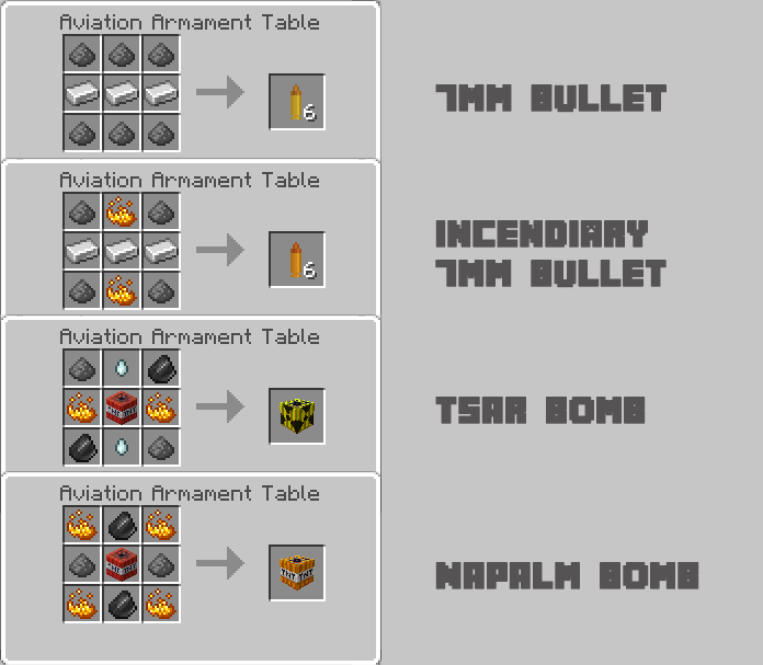 -Netherite Airplanes: Incendiary Ammo-Standard TNT, Napalm and Tsar Bomb.