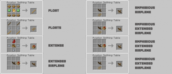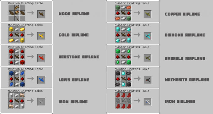-Amphibious Airplane (Wood, Gold, Lapis, Redstone, Copper, Iron, Diamond, Emerald,Netherite): Allows the plane to land on water.