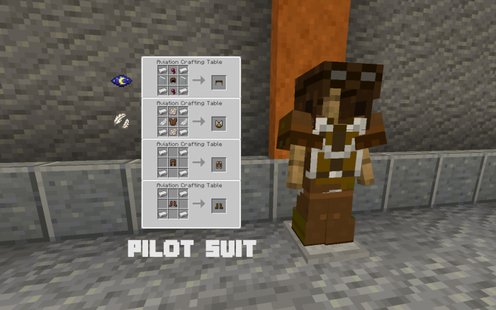 -Pilot suit: (helmet, chestplate, leggings, boots) This suit has the same protection as an iron armor, but half the resistance. The pilot helmet gives night vision during 25 and the pilot chestplate gives slow falling during 6 seconds (functioning as a parachute) every time you wear it from the main bar.