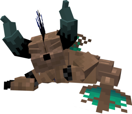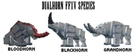 A large, two-horned herbivore commonly found around world. Using their sturdy legs to support them, they charge at enemies with their entire body weight, use their horn to throw rock and Can manipulated their horn. Their rough, armor-like skin protects them from both hunters and the heat.