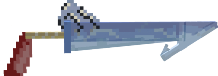 is a longsword terminating in a long hook with a shimmering blue, water-like blade. The grip is wrapped in a brown material, and a red ribbon hangs from the pommel area