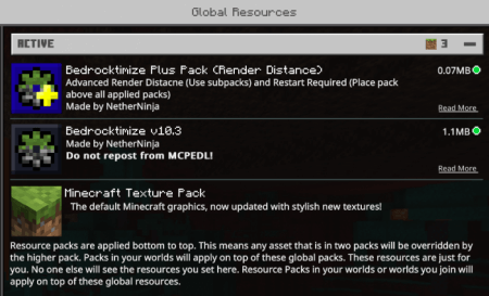Bedrocktimize is a really useful resource pack that adds and allows you to access many settings that are organized in their respective settings panels. Bedrocktimize changes the settings interface and start screen interface while keeping minecraft's vanilla style.