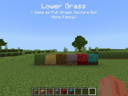 Lower Grass: Same As Full Grass Texture But The Side Texture Is Lowed To Provide A Fancy Look! ( Doesnt Changes The Block Icon To Prevent Confusion With Other Block)