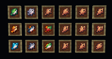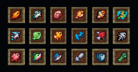Аддон добавляет в Майнкрафт 69 новых предметов: новые комплекты брони, уникальные виды рыб с различными эффектами, а также виды рыб для изготовления.