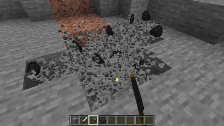 Тот же принцип действует и в отношении руд: при добыче блока соседние блоки того же типа также падают. Эта функция оптимизирует время добычи и резания, обеспечивая более плавный и практичный игровой процесс.