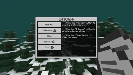 Теперь, когда вы находитесь в меню, вы можете получить доступ ко всему, что может предложить этот аддон. Чтобы начать искусственную метель в любом измерении или биоме, нажмите кнопку «Snow». Вы можете начать обычный шторм, нажав кнопку «Normal», или вы можете начать сильный шторм, нажав кнопку «Intense». Чтобы остановить метель, нажмите кнопку «Stop».