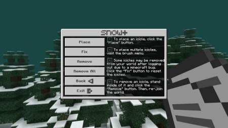 Чтобы создать сосульку, сначала перейдите в то место, где вы хотите, чтобы сосулька была. Затем откройте меню и нажмите кнопку «Icicles». Используйте кнопку «Icicles», чтобы создать сосульку, и кнопку «Remove», чтобы удалить сосульку. Вы также можете удалить все сосульки с помощью кнопки «Remove All». Учтите, что сосульки останутся видимыми даже после удаления. Вы можете выйти из мира и войти в него снова, чтобы это исправить. При входе в мир некоторые сосульки могут не загружаться. Вы можете исправить это с помощью кнопки «Fix».