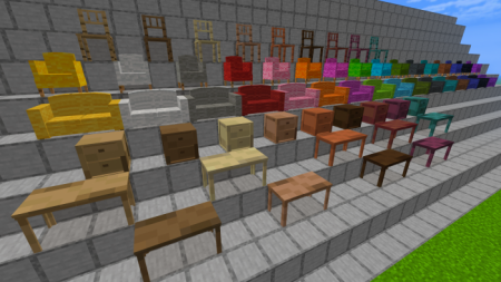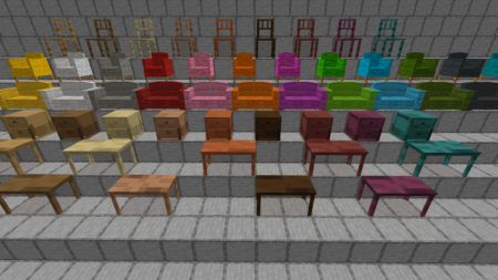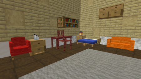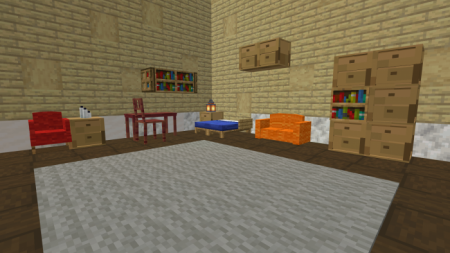 Если в вашем мире Майнкрафт не хватает красивого и реалистичного интерьера, то этот аддон то, что нужно! Он включает в себя более 84 новых предметов: кресла и диваны из всех видов шерсти, стулья, столы и тумбочки из всех пород дерева. Все предметы из этого дополнения можно создать и получить в режиме выживания.