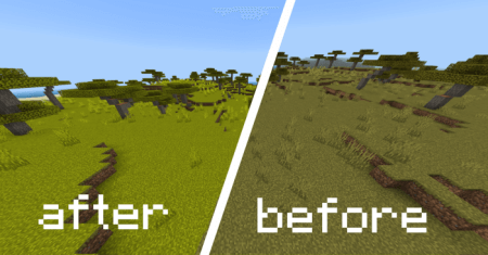 C этим пакетом текстур природа заиграет яркими красками. Интенсивная и насыщенная зелень разбавит стандартный вид природы Майнкрафт.